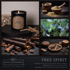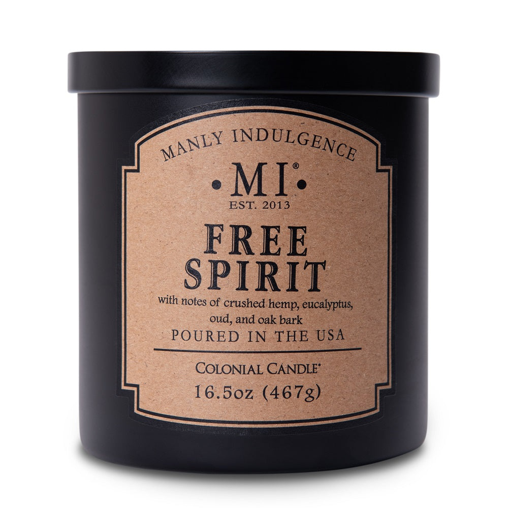 Release your inhibitions with Free Spirit. Hemp and smoked cedarwood with a touch of eucalyptus join for this smoky, delicious fragrance. This bold fragrance from the Manly Indulgence Classic Collection is 16.5 ounces of awesome. A black jar and black lid accent this neutral choice perfectly, with the ability to place this anywhere in your home.Fragrance Notes: