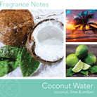 Summer fresh coconut with lime and tropical fruits is a breath of fresh, warm air. Escape to a summery island with delicious Coconut Water. Featuring our premium fragrance load for a superior fragrance experience.