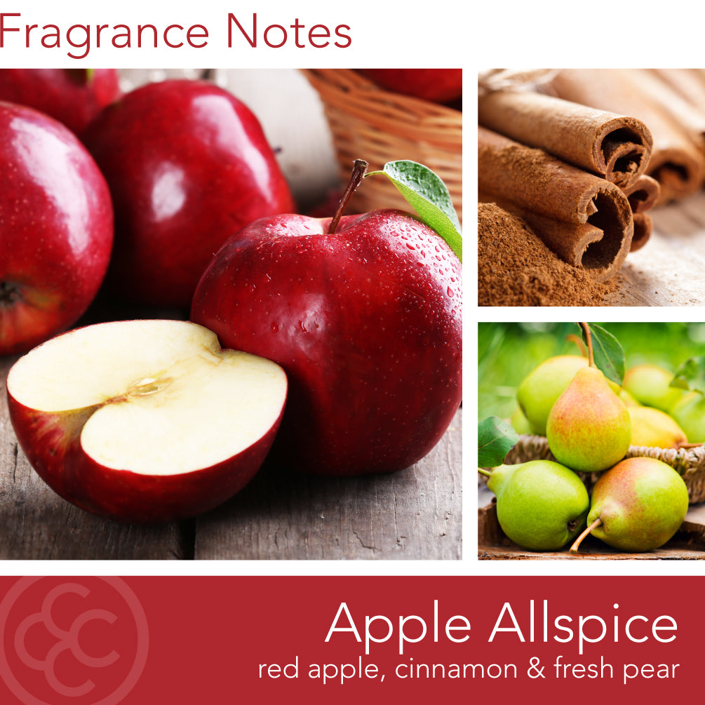 - SPICE | Apple Allspice has an intriguing fragrance of freshly ground cinnamon, allspice, and aromatic clove. Lifted by its champion, crisp apple, with a touch of vanilla, makes Apple Allspice the perfect harvest fragrance.
