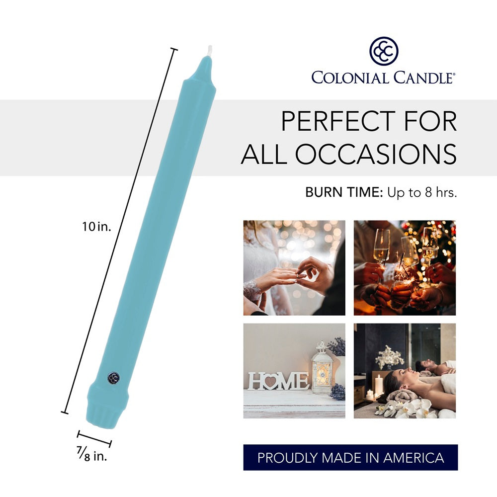 Our soothing unscented ten-inch classic Coastal Blue taper candles burn virtually drip-free for up to eight hours. A refreshing neutral hue, these taper candles bring a breath of fresh air to your home décor.