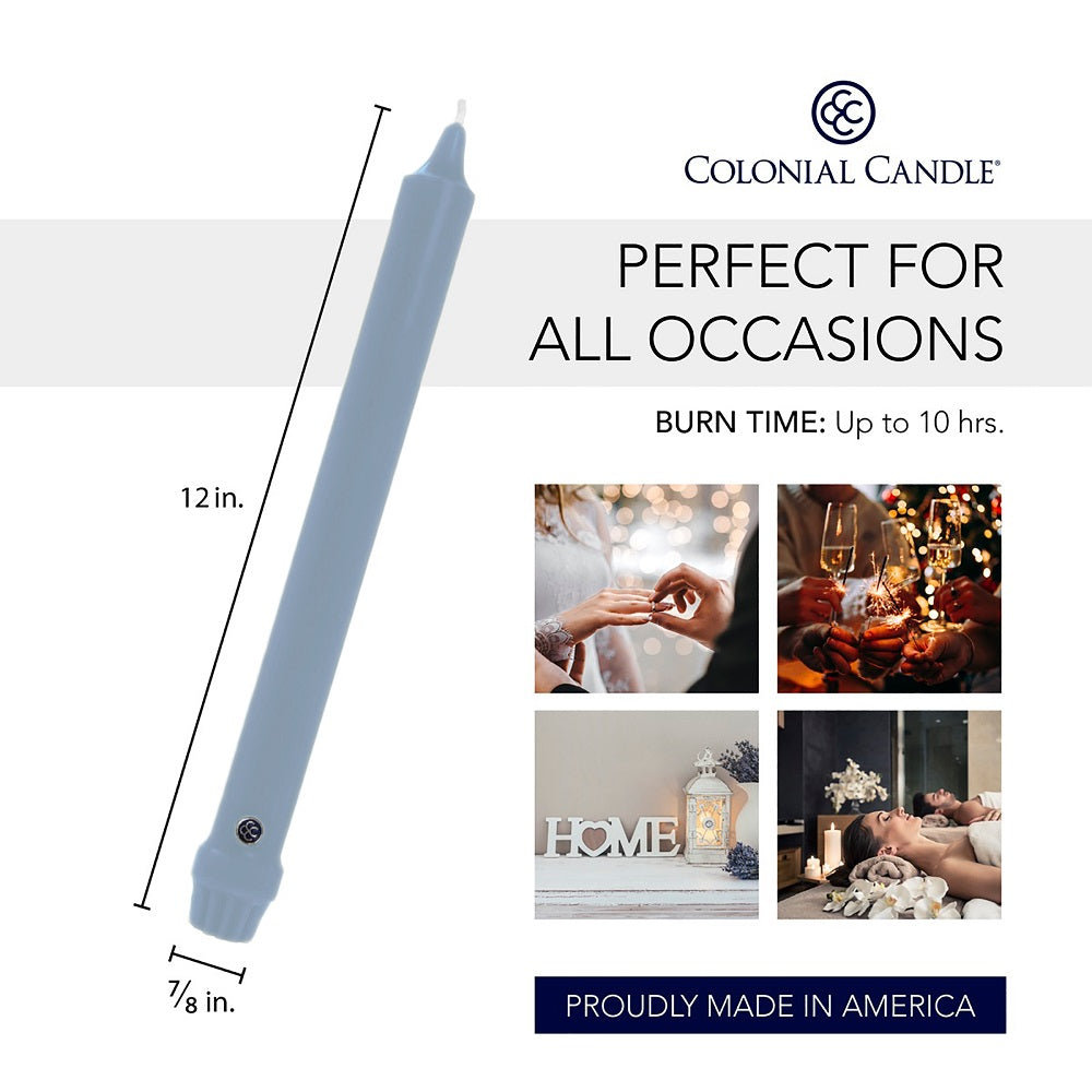 Our rich blue unscented twelve-inch Wedgewood taper candles burn virtually drip-free for up to ten hours. With a refined and rich blue, these Wedgewood taper candles bring a breath of fresh air to your home décor.