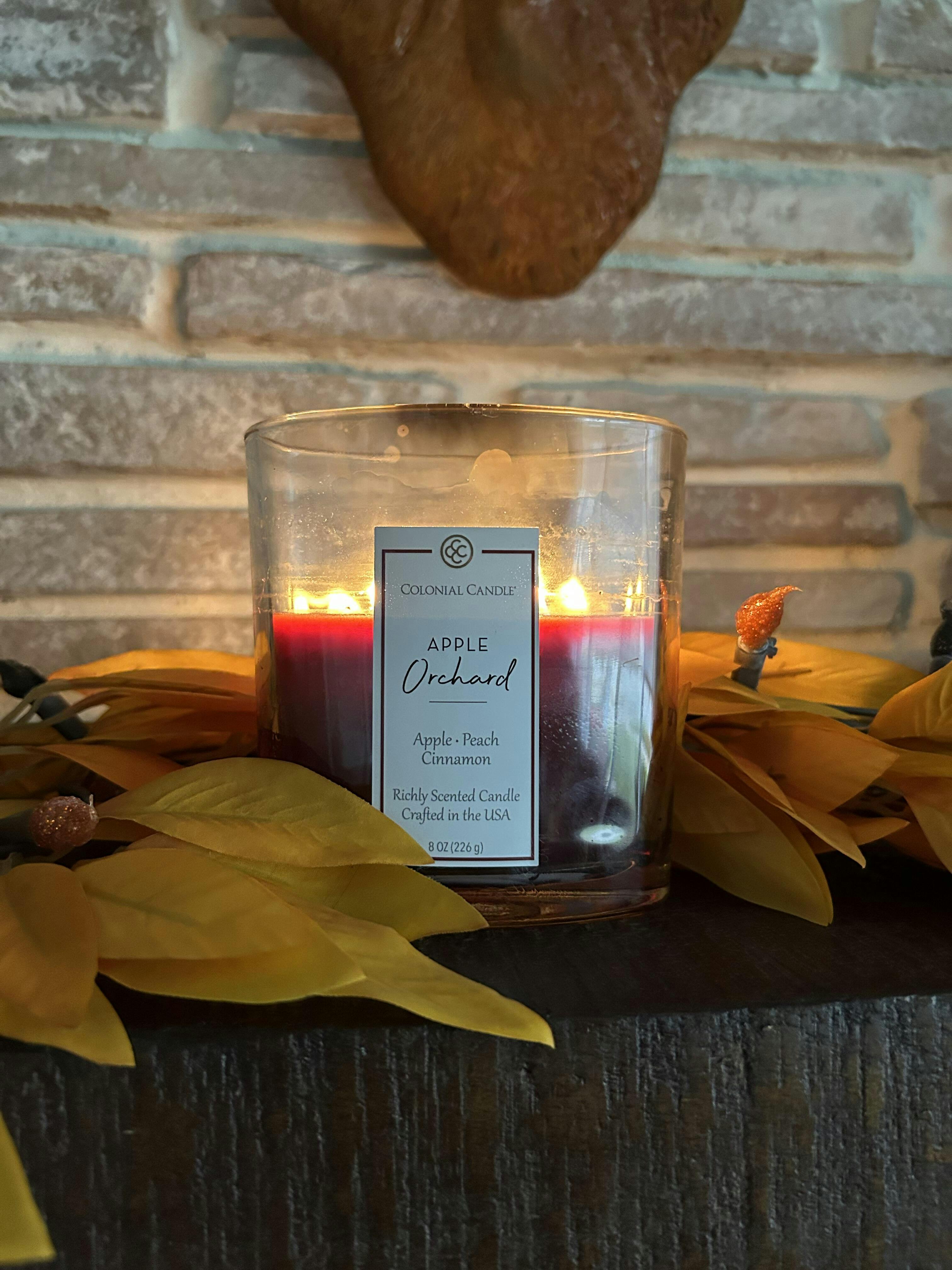Apple Orchard is a fresh, fruity favorite from Colonial Candle. A traditional fall fragrance that has transcended the season for a year round, delicious scent. Sliced apple, fresh peaches, and a touch of cinnamon stick are whipped together for a mouthwatering aroma. Added complexity of musk, freesia, and bergamot round out this apple candle.