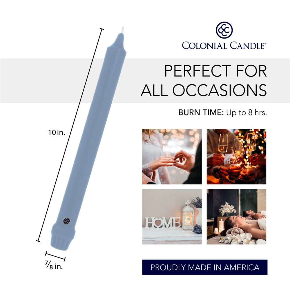 Our rich blue unscented ten-inch Wedgewood taper candles burn virtually drip-free for up to eight hours. With a refined and rich blue, these Wedgewood taper candles bring a breath of fresh air to your home décor.