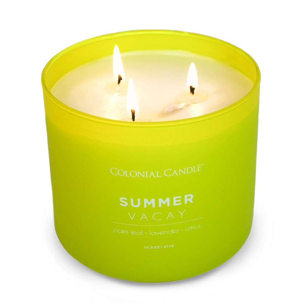 Housed in a vivid lime-green glass jar with a shiny golden metallic lid, this 14.5oz/3-wick candle adds a cheerful pop of color and freshness to any space. Perfect for brightening everyday moments or setting a relaxed vacation mood, Summer Vacay delivers sunshine in every burn.