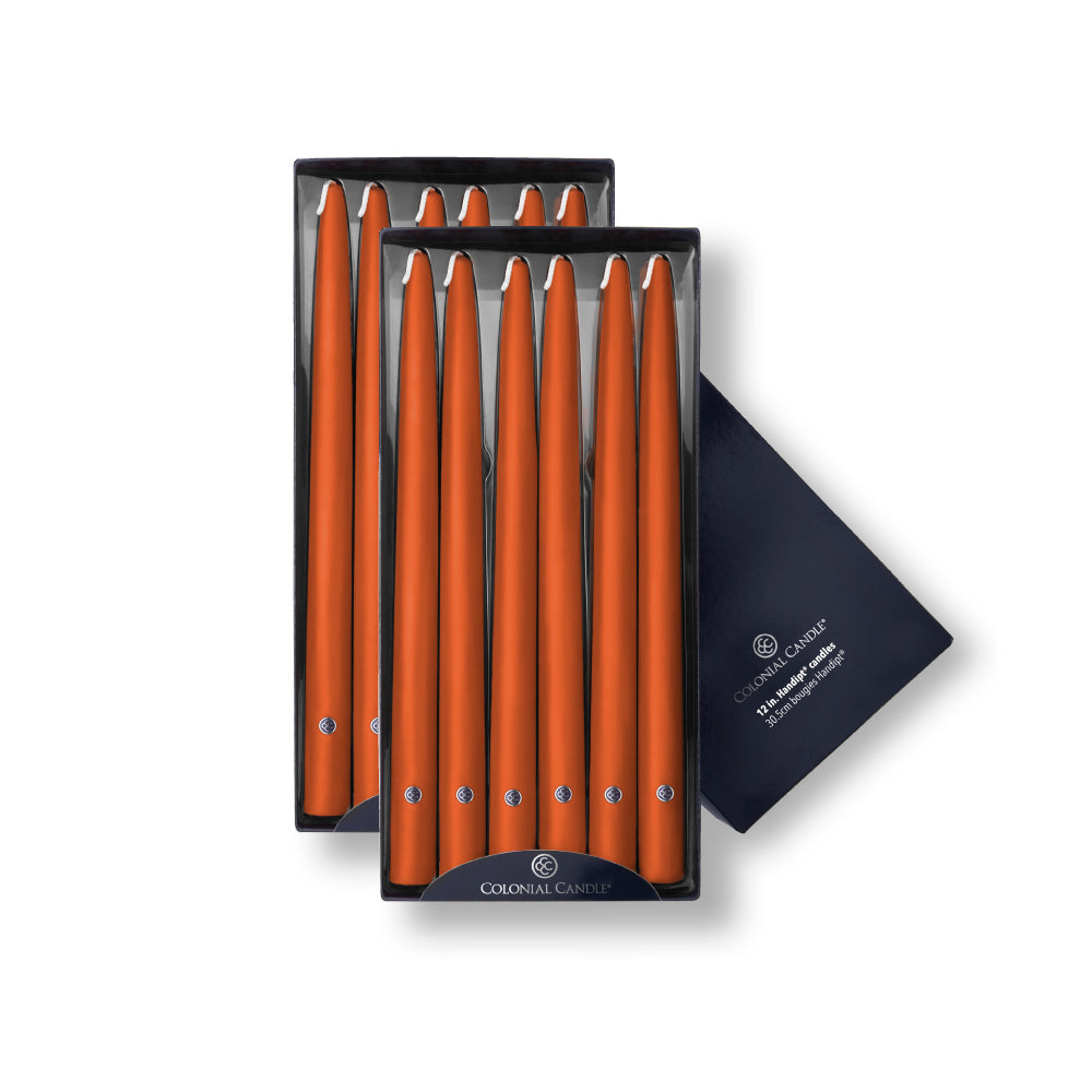 Our twelve-inch cozy and colorful Pumpkin taper candles are handipt™, with a virtually drip-free burn time of up to ten hours each. A rich, warm color, our Pumpkin taper candles add a festive touch to your fall décor or a cozy feel anytime of the year.