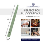 Our soft and neutral ten-inch Colonial Green taper candles are handipt™ that burn virtually drip-free for up to eight hours. These calming, airy green color taper candles bring a soothing touch to your home décor.