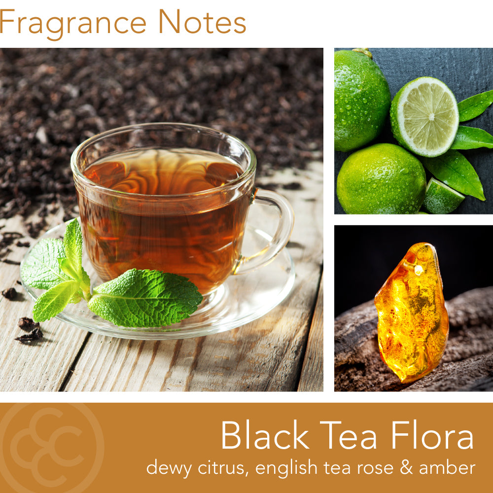 - BOTANICAL | Black Tea Flora’s unforgettable blend of red berries, pomegranate, and rose petals are perfectly balanced by the bold undertones of tea and patchouli. Transform your home into a fine tea house and enjoy the fragrant experience again and again.