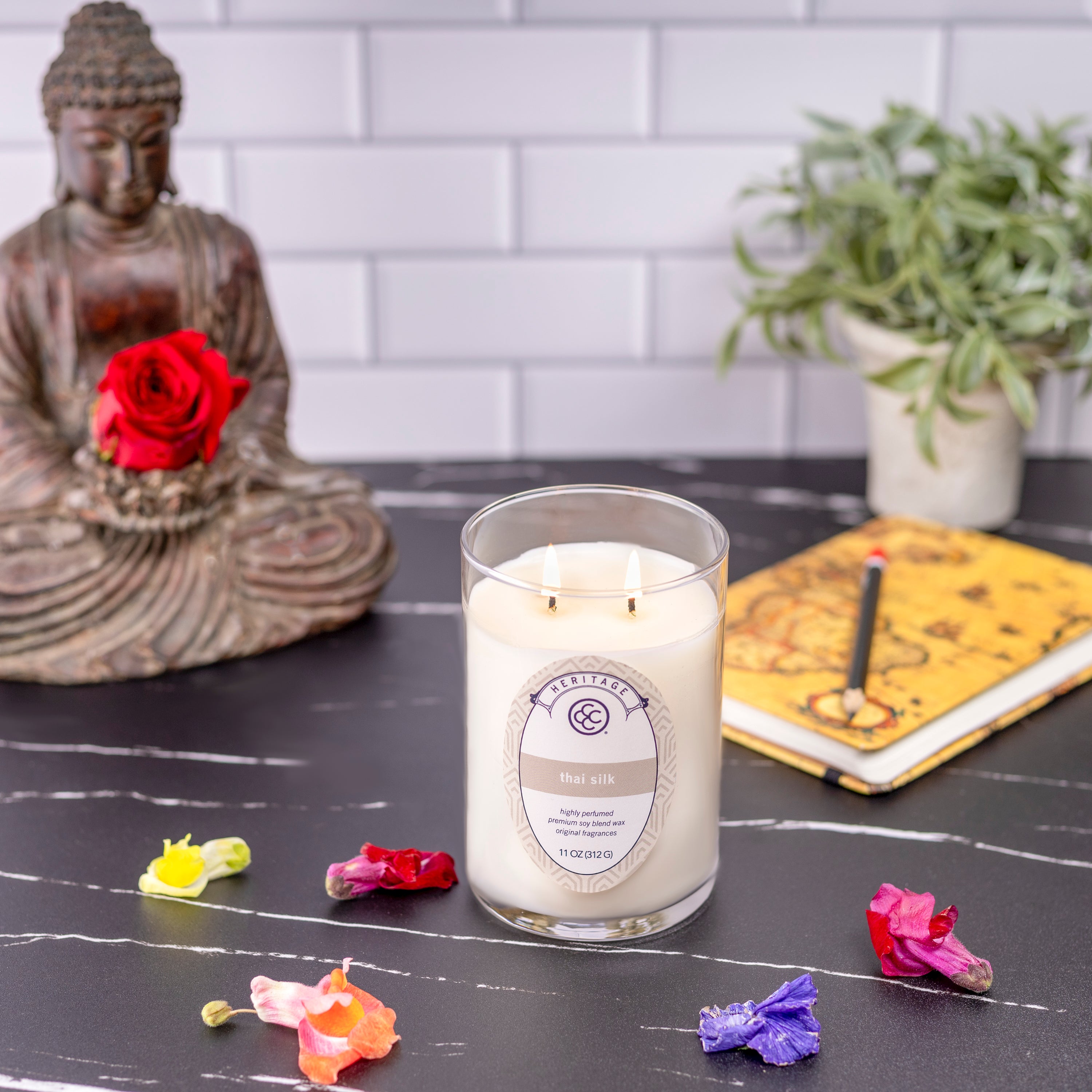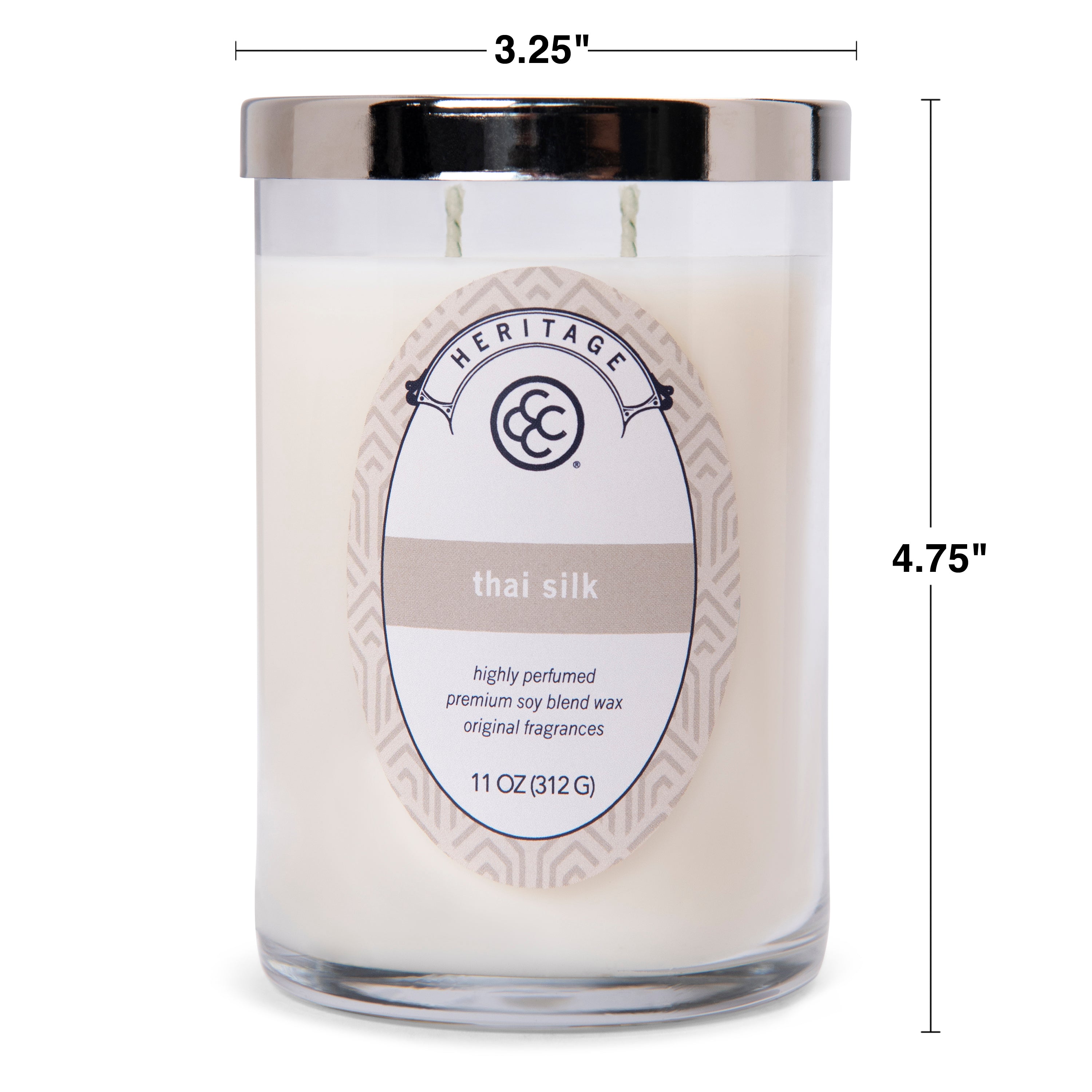 Immerse yourself into summer with Thai Silk. Sun-ripened lemon and sweet orange swirl together with a bouquet of roses and white jasmine to create a refreshingly alluring aroma. Finishing off with patchouli and vanilla, this fragrance has something for everyone! The Heritage Collection celebrates your favorite fragrances from the Colonial Candle archives. The fragrances have remained the same while the look of the candle has been modernized. The sleek jar with a shiny silver lid adds a touch of elegance to your home. Not to mention, the geometric twist made to the label. The Heritage Collection remains true to its core with some added flare!About The Collection: