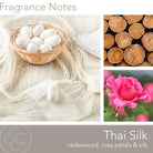 Base Notes: Cedarwood, Patchouli, Vanilla SWEET | Welcome everything the warmer months have to offer into your home with Thai Silk. Bright fruits, rose petals and vanilla are braided together for a robust summer fragrance.