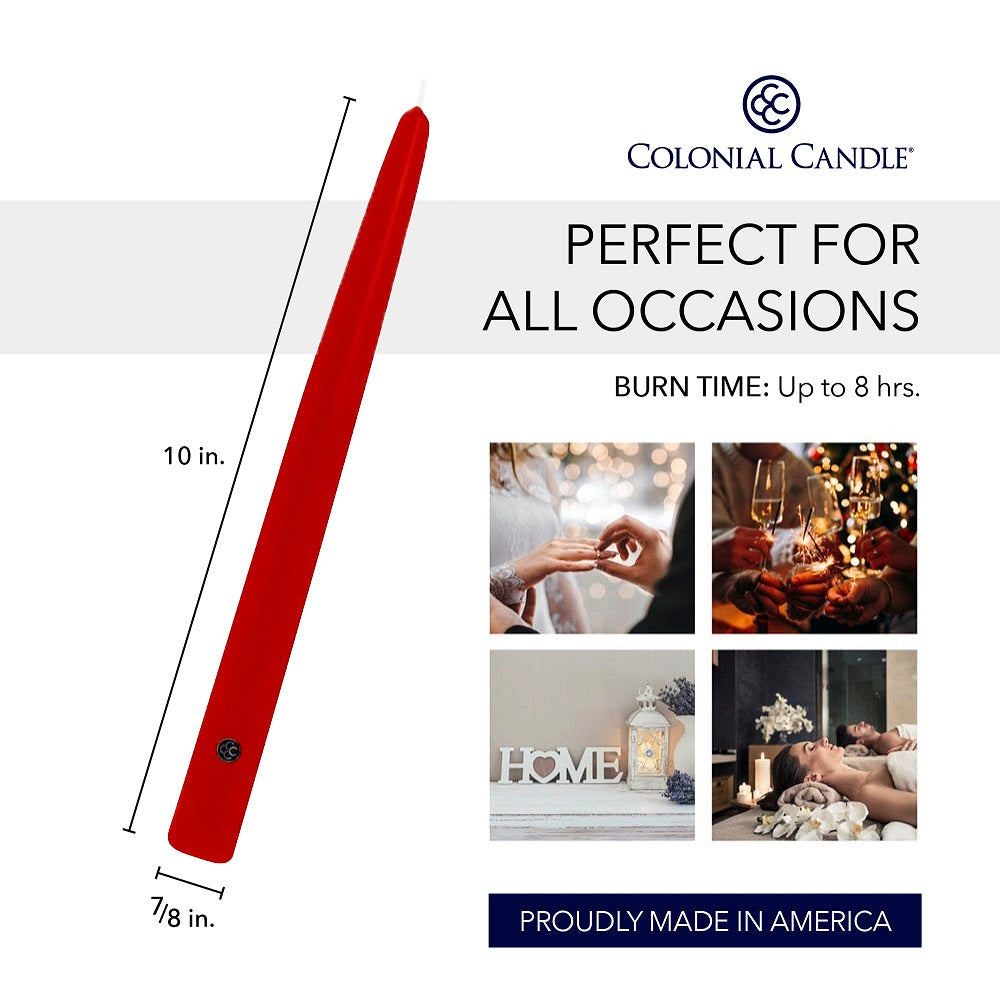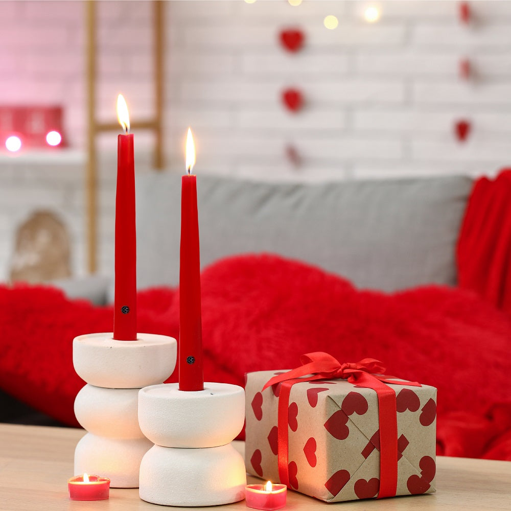 Imagine a Valentine’s Day dinner where everything feels intentional - the table set just before sunset, crisp linens, polished glassware, a bouquet of deep red roses, and the gentle clink of wine glasses. As evening settles in, these red tapers take center stage, casting a warm, dramatic glow that instantly elevates the mood. The color is bold, confident, and timeless - made for moments that deserve to be remembered.