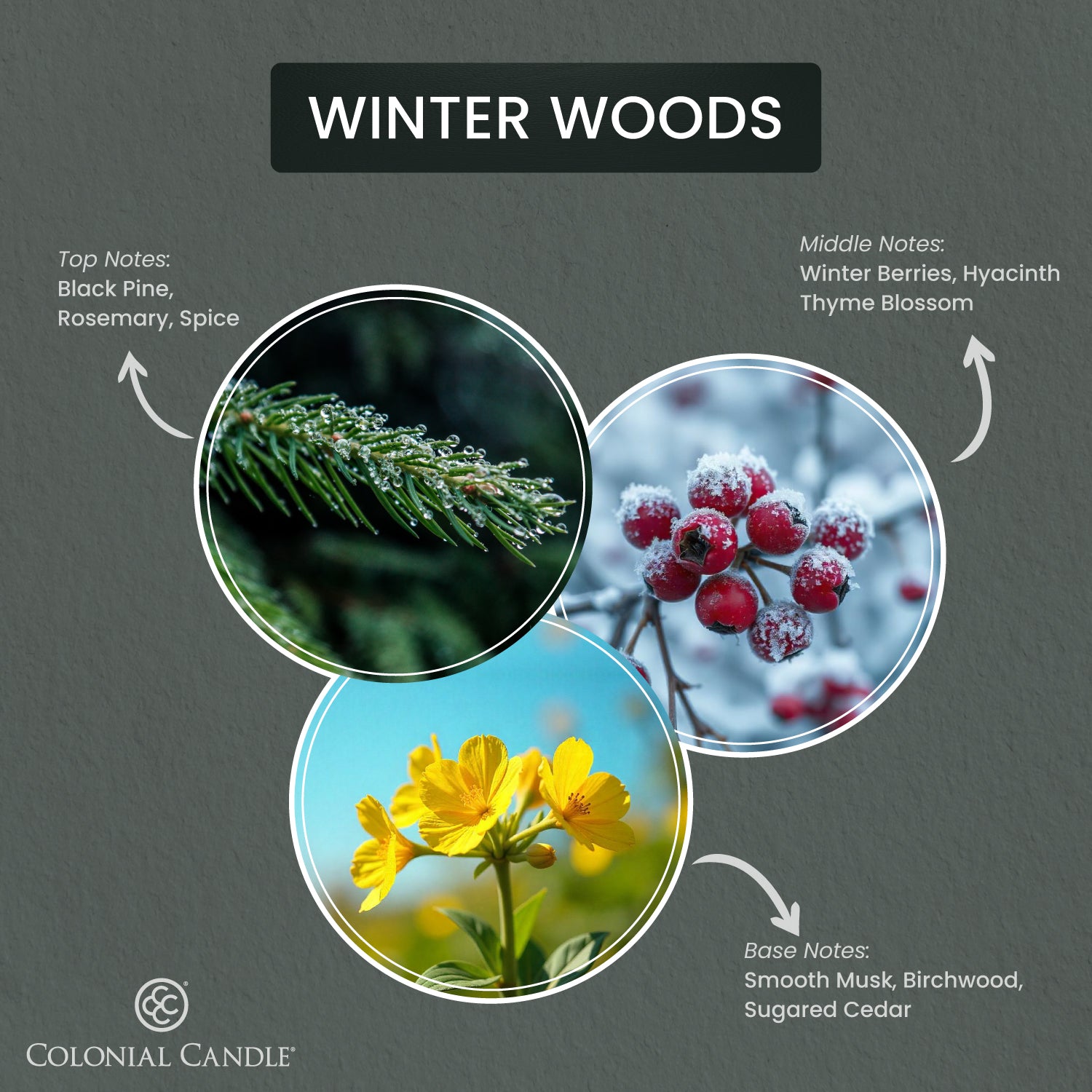 • FRAGRANCE | Top Notes: Winter Berries, Rosemary, Spice; Middle Notes: Thyme Blossom, Hyacinth Botto; Base Notes: Black Pine, Birchwood, Sugared Cedar, Smooth Musk.