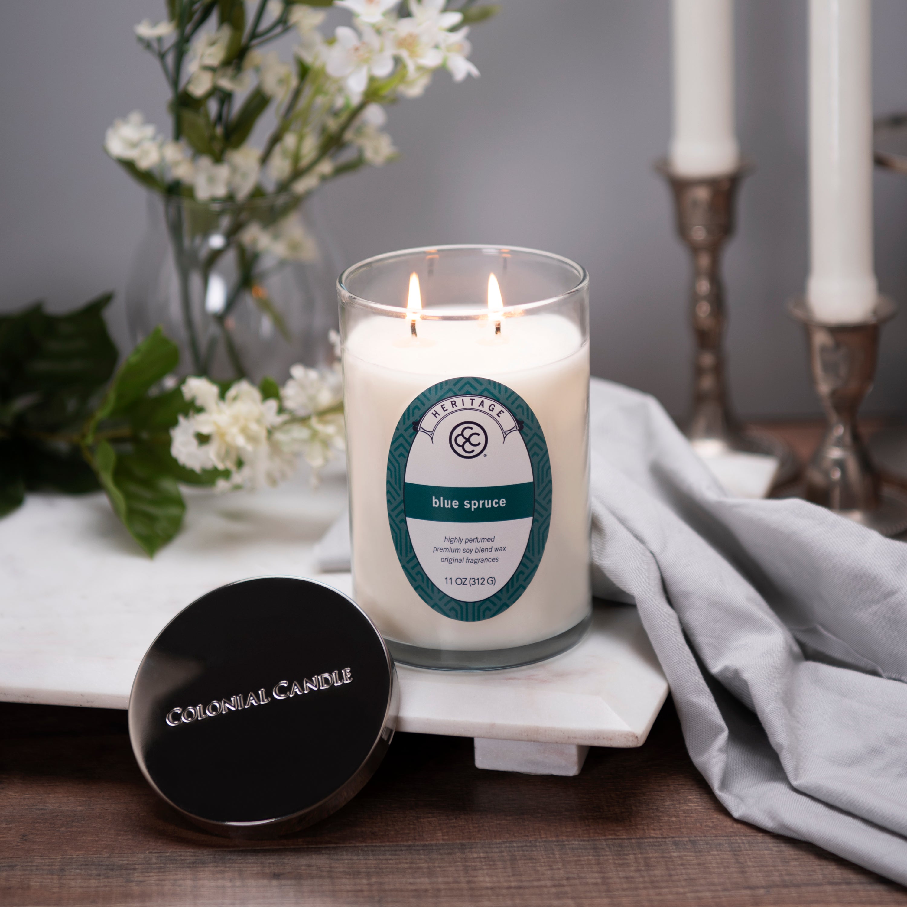 Blue Spruce will make your home sing with bold woodsy fragrance year round. Poured into a tall cylinder jar adorned with a shiny Colonial embossed lid, this candle makes a subtle, sleek statement. A paper label with a nod to this fragrances roots, the Oval, is the perfect finishing touch. The Heritage Collection honors the legacy of Colonial fragrance with bringing original formulations back. Stock up on your favorite fragrances before they go back into the Colonial vault!Fragrance Notes: