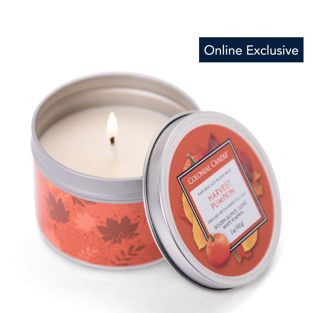 The Colonial Candle Harvest and Holiday Gift Tin Collection celebrates the holiday season with classic Colonial Candle fragrances. Poured into a 5oz tin, this collection is the perfect addition to any gift. Enjoy the same fragrance power as the Colonial Candles Classic in just a small dose. Nothing says holiday season like Colonial Candles Harvest and Holiday!