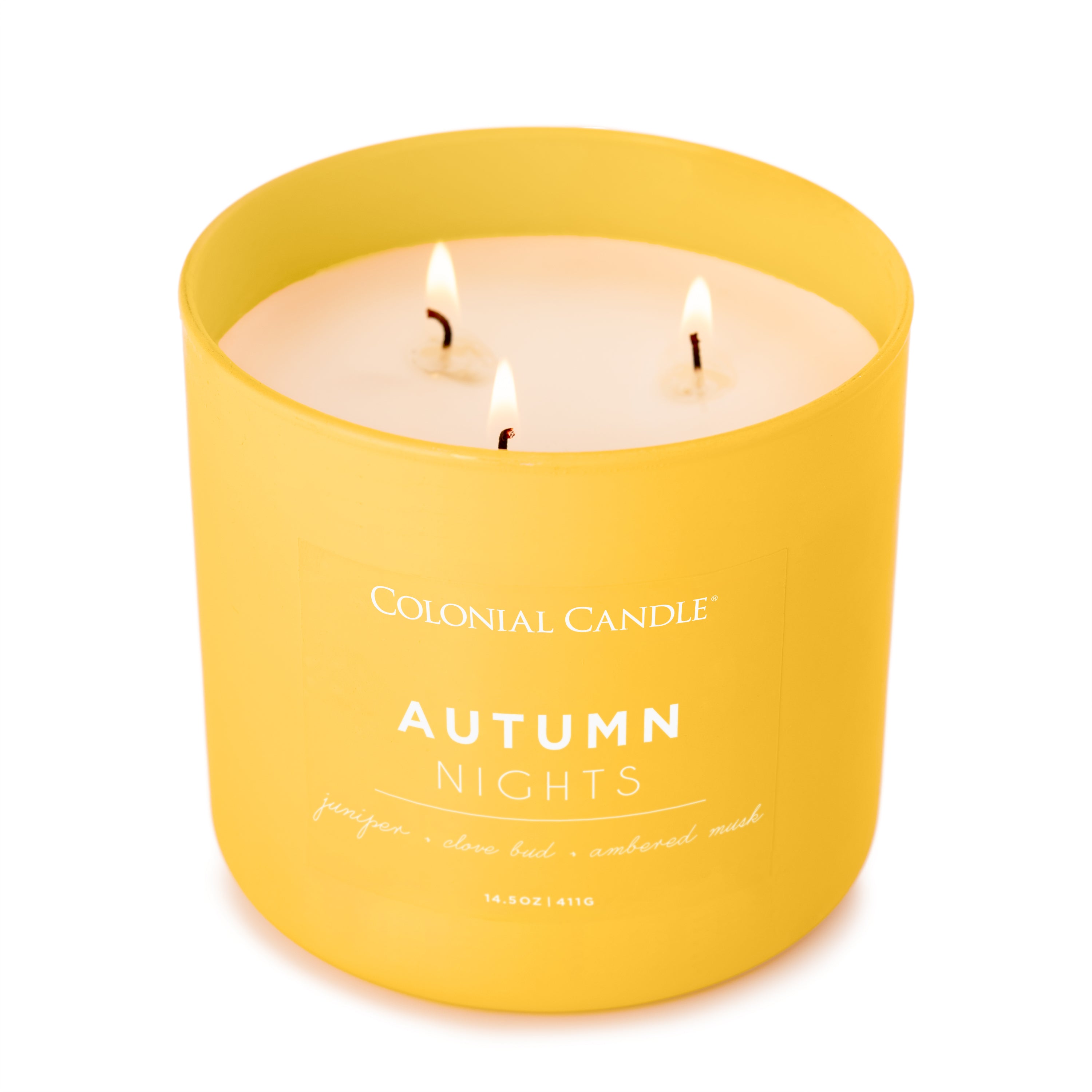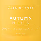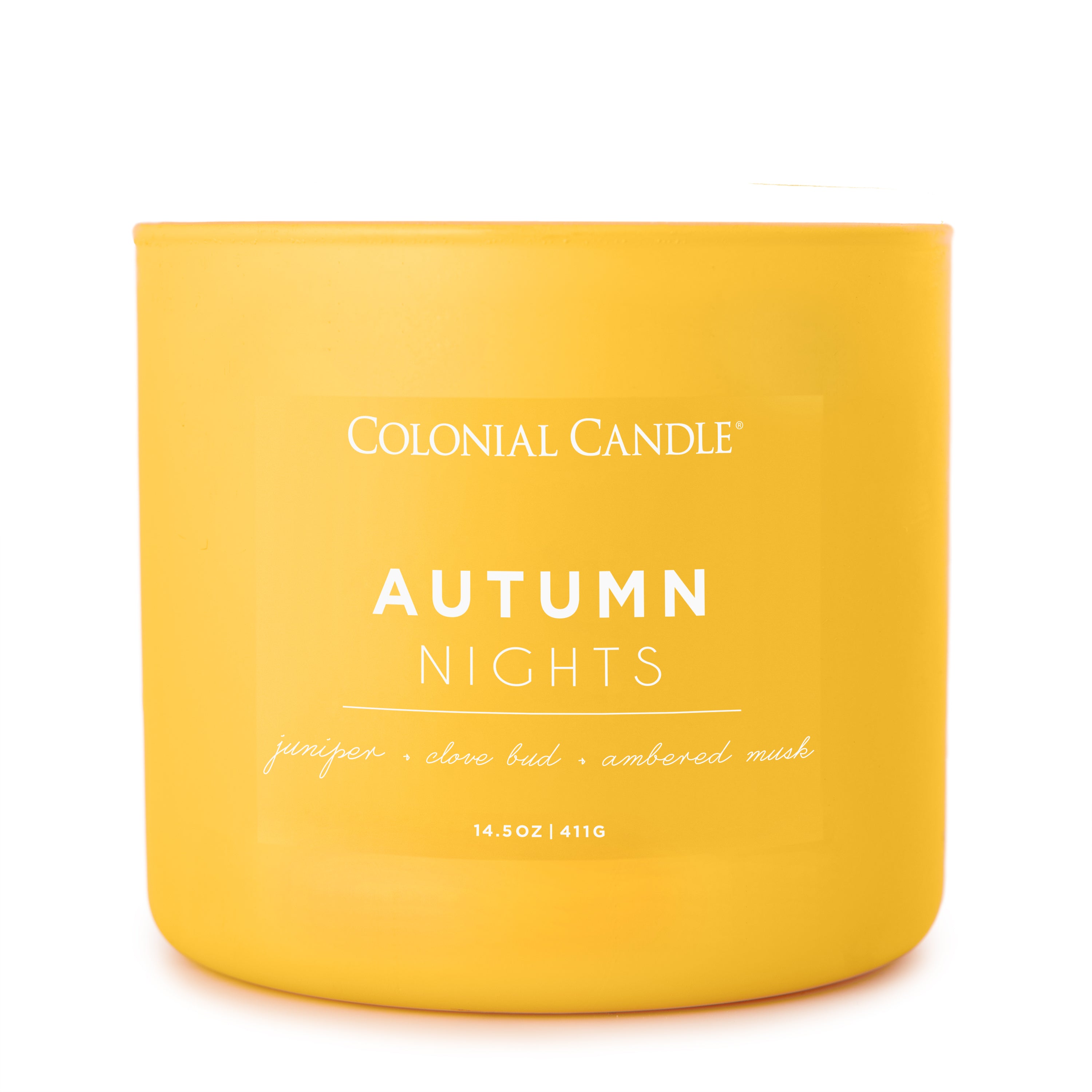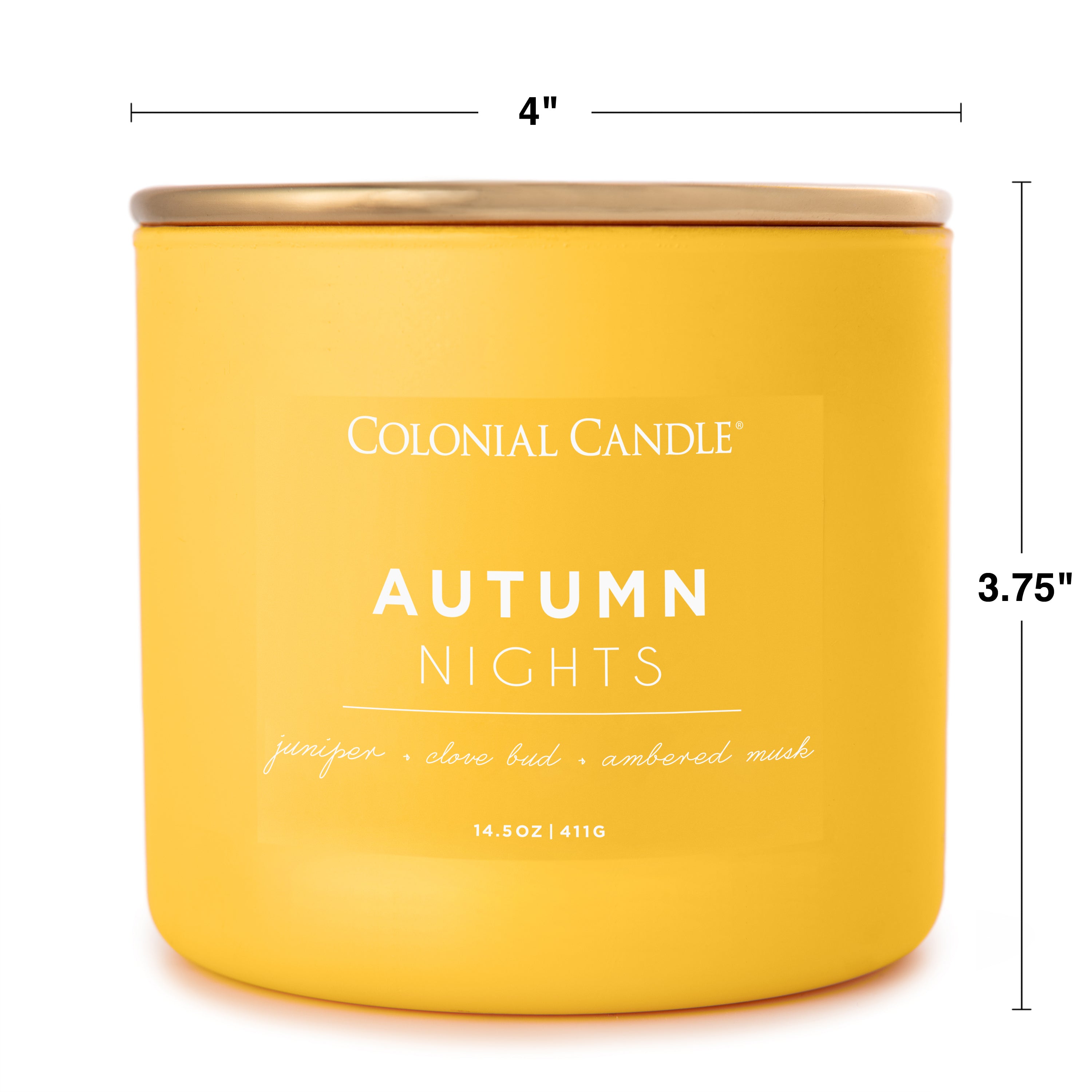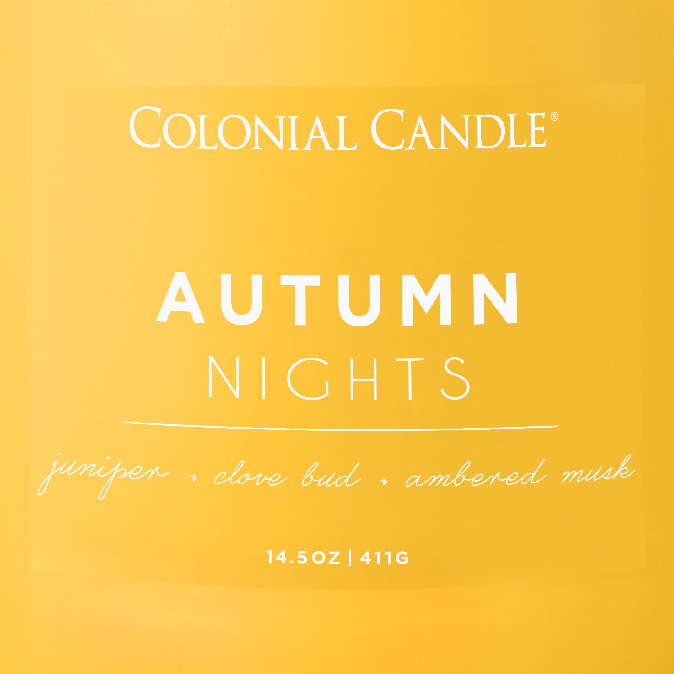 Experience your favorite fall day over and over again with Autumn Nights. Poured into a 14.5-ounce jar topped with a inset shiny gold lid, this candle will make your décor style POP. Wrapped in a clear label, the bright color and bold fragrance speak for themselves. Brighten your day with the Pop of Color Collection by Colonial Candle!