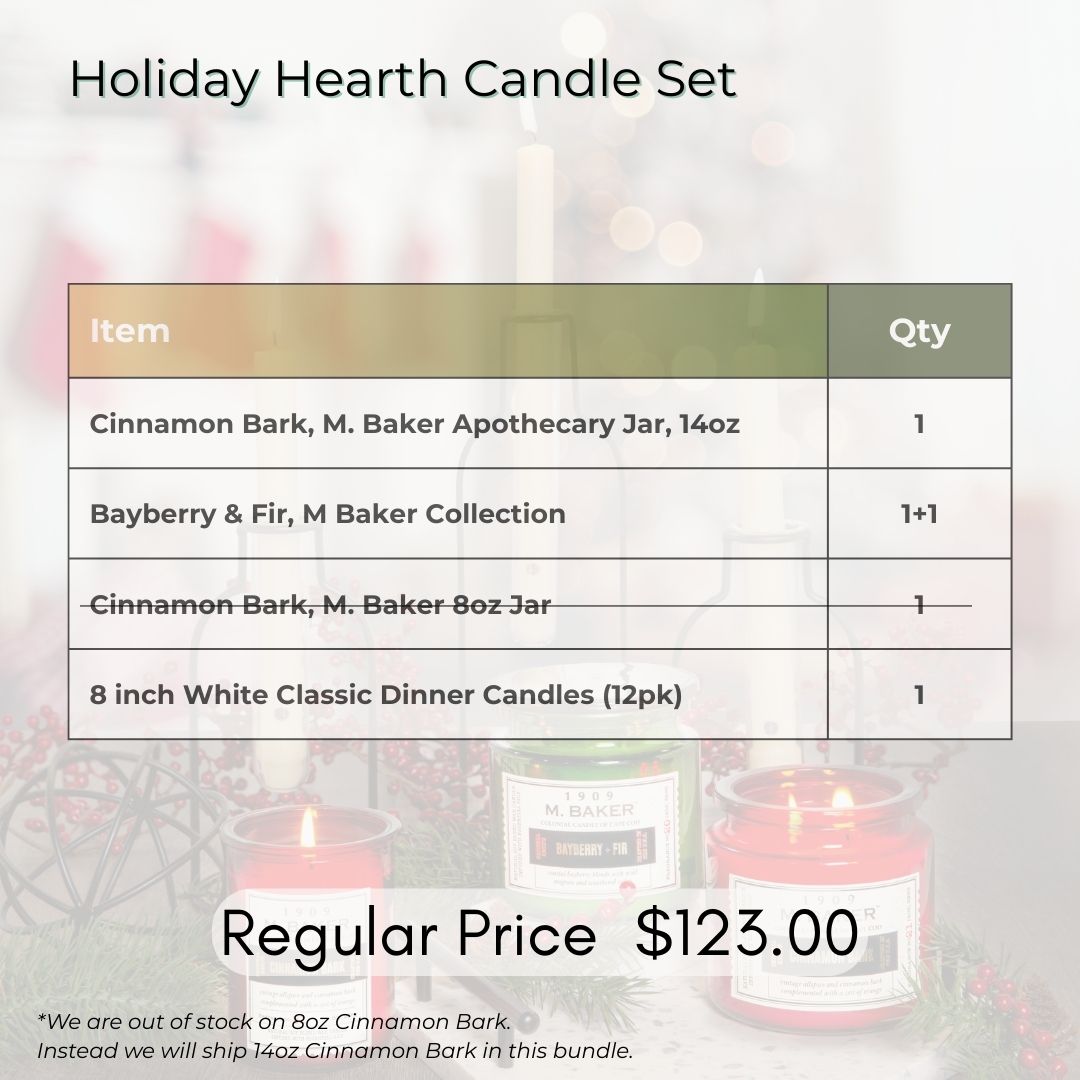 Featuring two Cinnamon Bark jar candles for a rich and spicy aroma, a Bayberry Fir jar candle for a fresh evergreen touch, and elegant 8-inch white taper candles to set a peaceful ambiance. This bundle brings together the best of winter’s comforting fragrances and timeless elegance, ideal for seasonal gatherings or as a thoughtful gift.